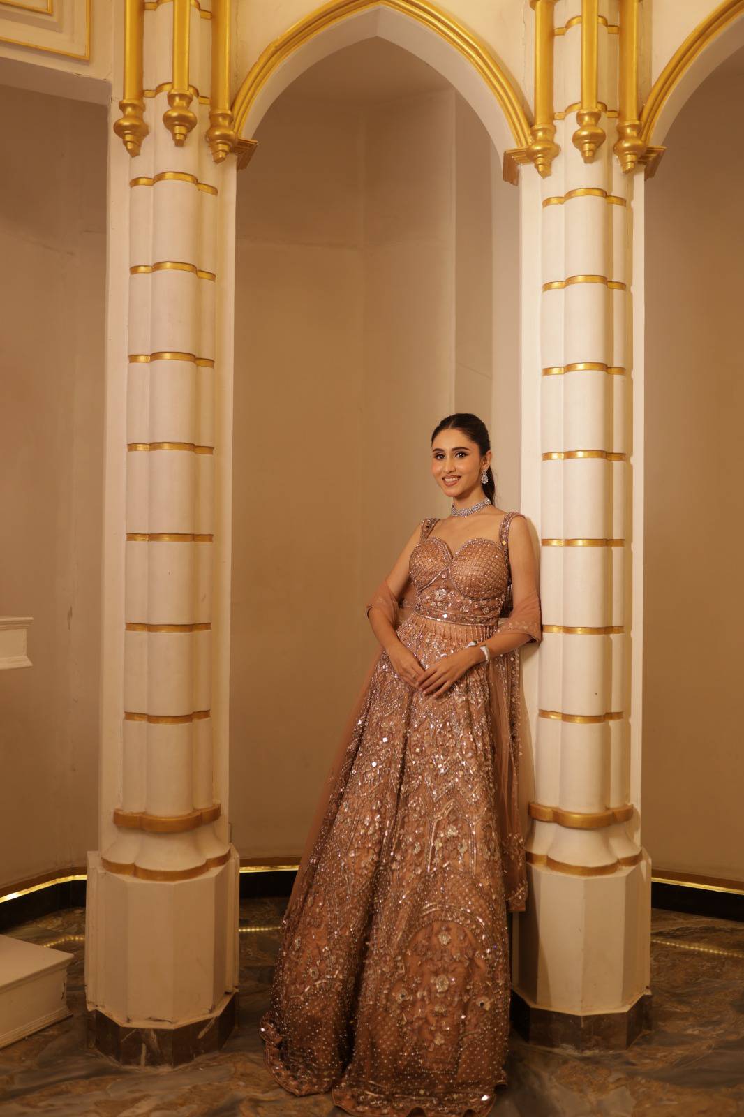 This stunning golden lehenga shines with heavy sequin and intricate embroidery work that adds richness and depth to the entire outfit. The structured blouse with detailed embellishments enhances the silhouette, while the voluminous flared skirt creates a dramatic and graceful look. Paired with a soft matching dupatta, the ensemble reflects luxury and elegance. The warm golden tone combined with fine craftsmanship makes this lehenga a perfect blend of glamour and timeless style.
