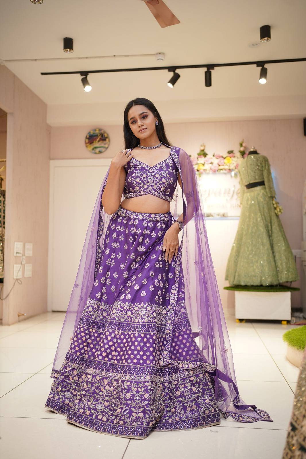A captivating purple lehenga set adorned with delicate silver floral embroidery, this ensemble radiates refined charm and contemporary grace. The intricately embellished blouse pairs beautifully with the flowing skirt, where detailed motifs bloom across the rich fabric, while the sheer dupatta adds a soft, ethereal finish. Styled with coordinated gemstone jewelry, this design blends modern elegance with traditional artistry, creating a look that feels both poised and effortlessly striking.